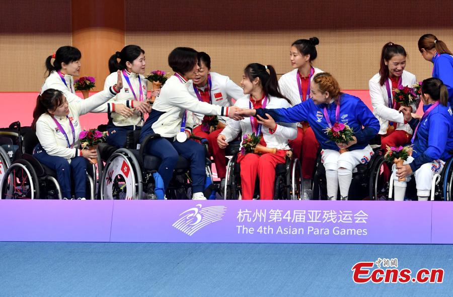 Team China (C), Team China's Hong Kong (L) and Team Thailand celebrate during the awarding ceremony for the Women's Foil Team at the 4th Asian Para Games in Hangzhou, east China's Zhejiang Province, Oct. 24, 2023. (Photo: China News Service/Lv Ming)