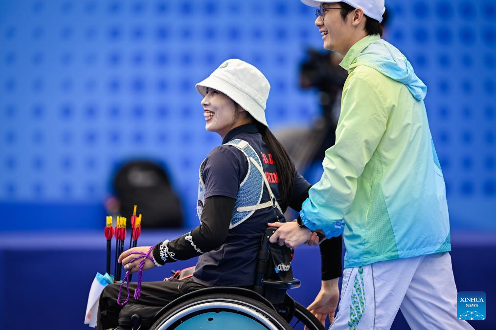 Wu Chunyan (L) of China reacts after the Women's Doubles Recurve Open Gold Medal Match of Archery between Wu Chunyan/Wu Yang of China and Zahra Nemati/Somayeh Rahimi Ghahderijani of Iran at the 4th Asian Para Games in Hangzhou, east China's Zhejiang Province, Oct. 25, 2023. (Xinhua/Wu Zhizun)