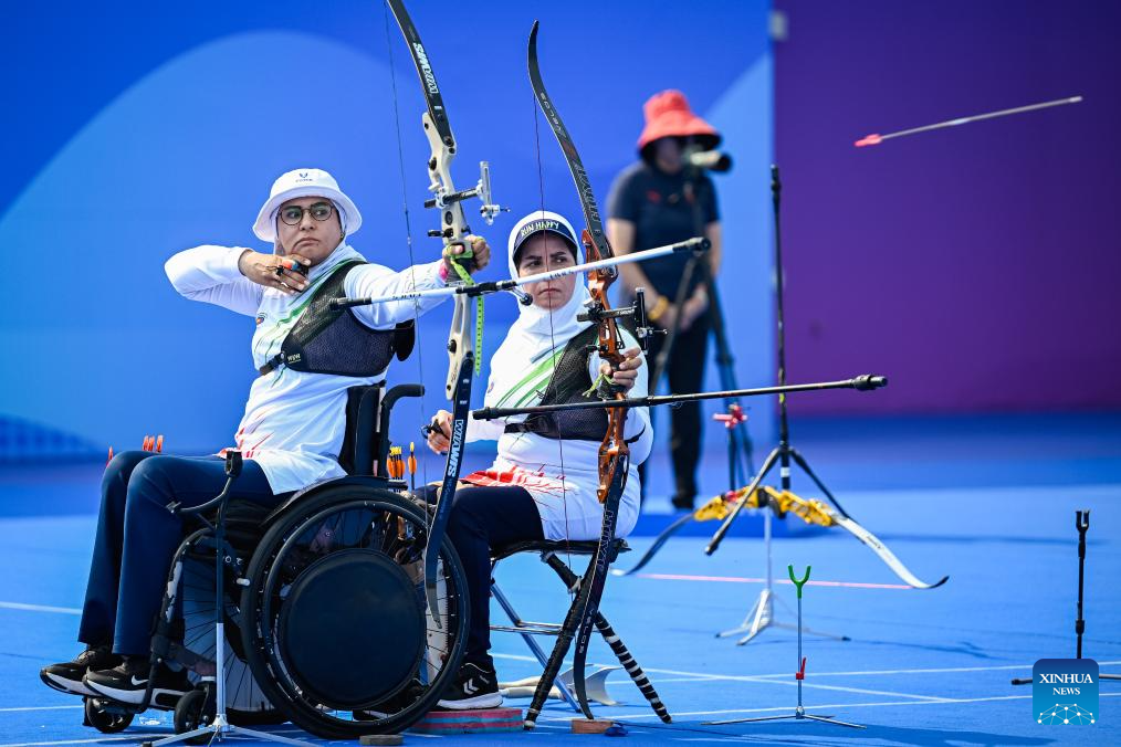 Zahra Nemati (L) of Iran competes during the Women's Doubles Recurve Open Gold Medal Match of Archery between Wu Chunyan/Wu Yang of China and Zahra Nemati/Somayeh Rahimi Ghahderijani of Iran at the 4th Asian Para Games in Hangzhou, east China's Zhejiang Province, Oct. 25, 2023. (Xinhua/Wu Zhizun)