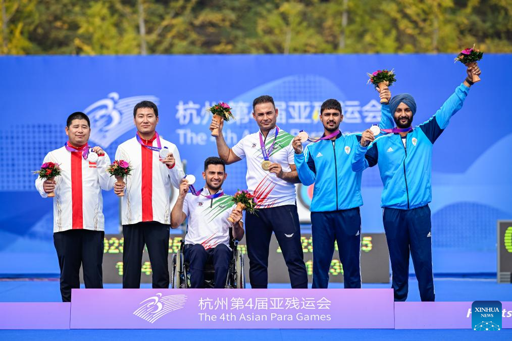 Gold medalists team Iran (C), silver medalists team China (L) and bronze medalists team India pose during the awarding ceremony for the Men's Doubles Recurve Open of Archery at the 4th Asian Para Games in Hangzhou, east China's Zhejiang Province, Oct. 25, 2023. (Xinhua/Wu Zhizun)