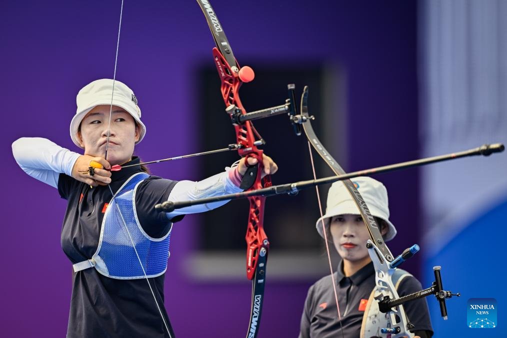 Wu Yang of China competes during the Women's Doubles Recurve Open Gold Medal Match of Archery between Wu Chunyan/Wu Yang of China and Zahra Nemati/Somayeh Rahimi Ghahderijani of Iran at the 4th Asian Para Games in Hangzhou, east China's Zhejiang Province, Oct. 25, 2023. (Xinhua/Wu Zhizun)