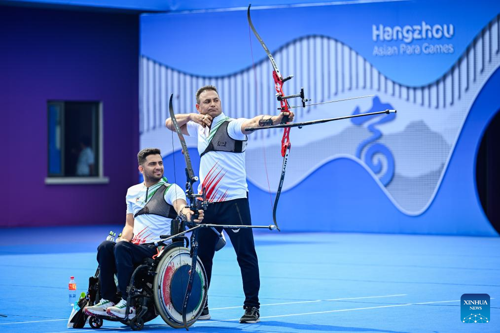 Mohammad Reza Arab Ameri (L) of Iran competes during the Men's Doubles Recurve Open Gold Medal Match of Archery between Gan Jun/Zhao Lixue of China and Mohammad Reza Arab Ameri/Gholamreza Rahimi of Iran at the 4th Asian Para Games in Hangzhou, east China's Zhejiang Province, Oct. 25, 2023. (Xinhua/Wu Zhizun)