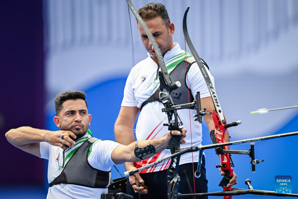 Gholamreza Rahimi (R) of Iran competes during the Men's Doubles Recurve Open Gold Medal Match of Archery between Gan Jun/Zhao Lixue of China and Mohammad Reza Arab Ameri/Gholamreza Rahimi of Iran at the 4th Asian Para Games in Hangzhou, east China's Zhejiang Province, Oct. 25, 2023. (Xinhua/Wu Zhizun)