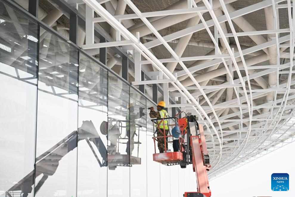 A builder works at the construction site of the stadium of the Xiong'an sports center in Xiong'an New Area, north China's Hebei Province, Oct. 24, 2023.