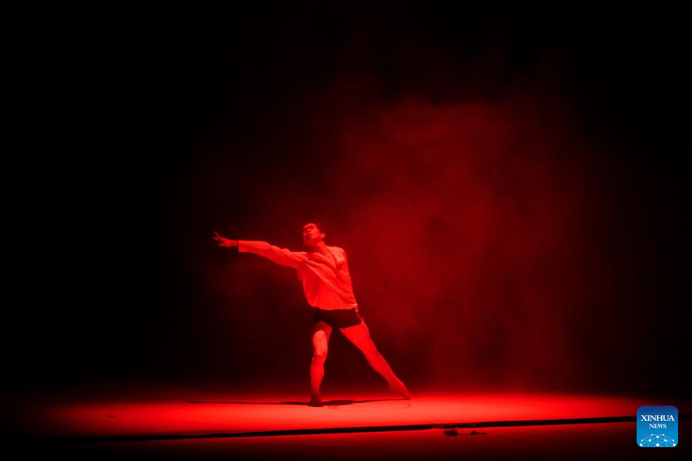 A dancer from China's Beijing Dance Theater is pictured while performing the dance drama "Three Poems" at the Palacio de Bellas Artes in Mexico City, Mexico, Oct. 24, 2023. (Xinhua/Xin Yuewei)