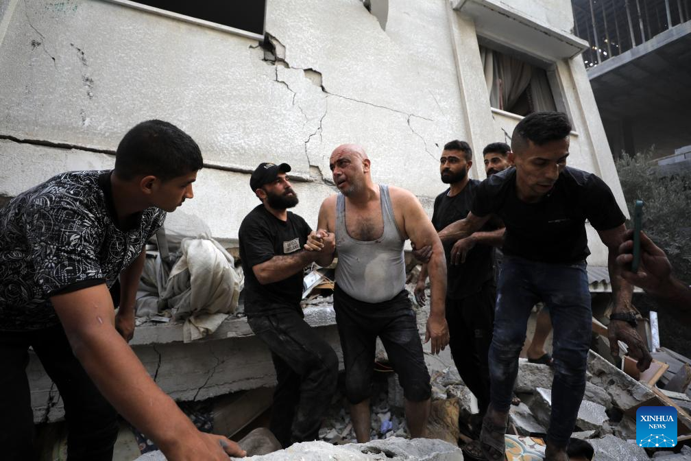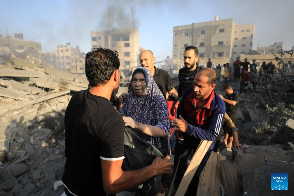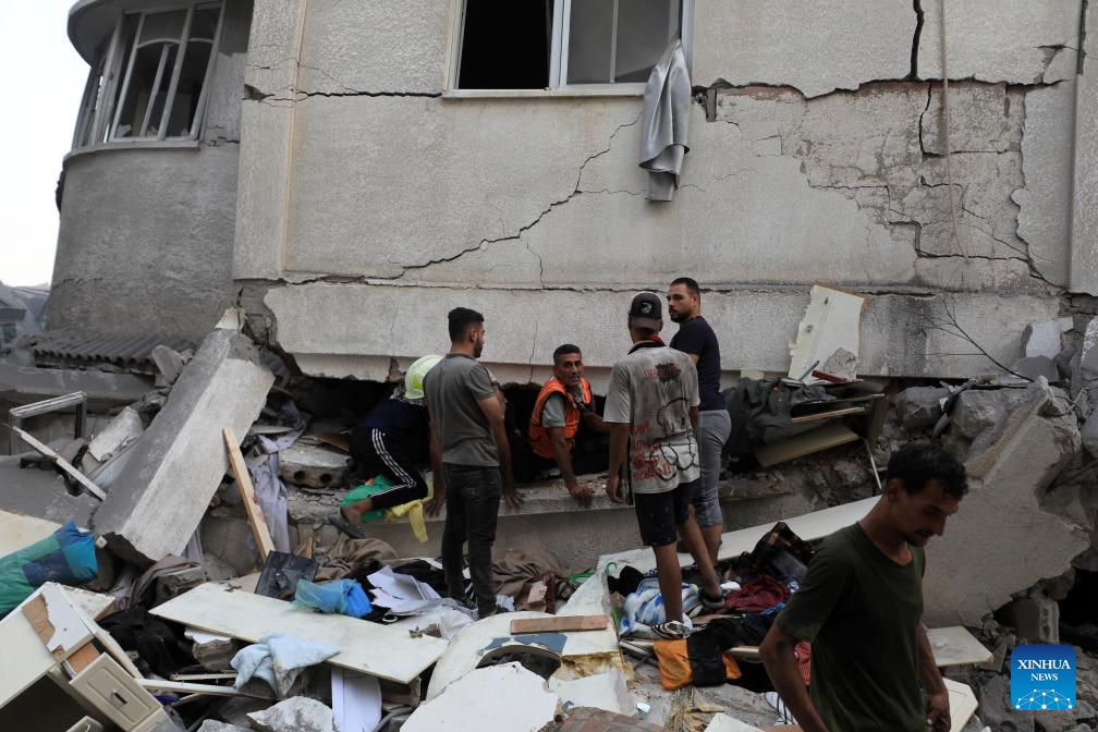 Palestinians conduct rescue work at destroyed buildings after Israeli airstrikes in Gaza City, on Oct. 25, 2023. The death toll of Palestinians from Israeli airstrikes on the Gaza Strip has risen to 6,546, said the Hamas-run Health Ministry in Gaza Strip on Wednesday. Meanwhile, 17,439 Palestinians were wounded in the coastal enclave, the ministry said in a statement. (Photo by Yasser Qudih/Xinhua)
