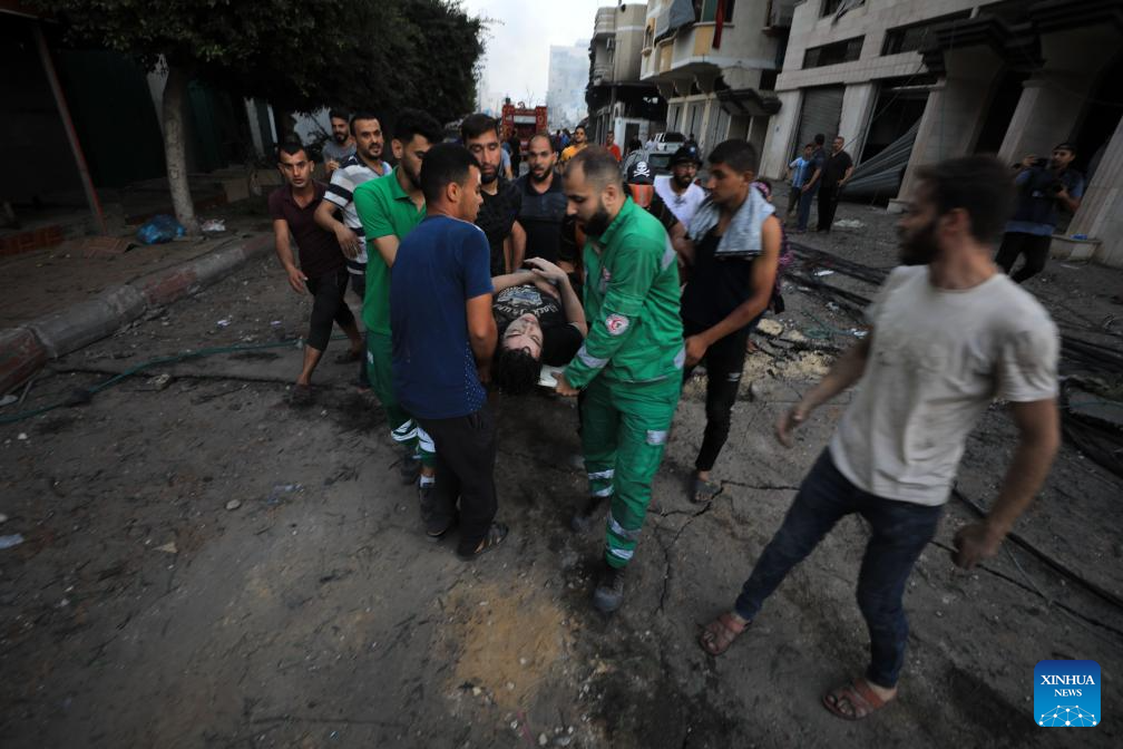 Palestinians transfer an injured man after Israeli airstrikes in Gaza City, on Oct. 25, 2023. The death toll of Palestinians from Israeli airstrikes on the Gaza Strip has risen to 6,546, said the Hamas-run Health Ministry in Gaza Strip on Wednesday. Meanwhile, 17,439 Palestinians were wounded in the coastal enclave, the ministry said in a statement. (Photo by Yasser Qudih/Xinhua)