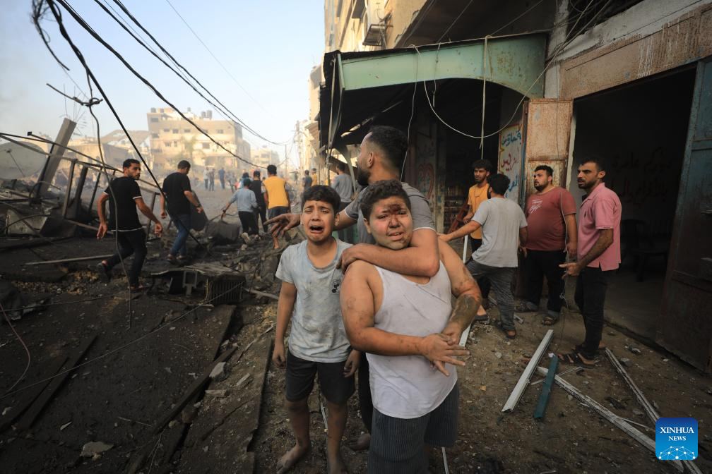 Palestinians are seen after Israeli airstrikes in Gaza City, on Oct. 25, 2023. The death toll of Palestinians from Israeli airstrikes on the Gaza Strip has risen to 6,546, said the Hamas-run Health Ministry in Gaza Strip on Wednesday. Meanwhile, 17,439 Palestinians were wounded in the coastal enclave, the ministry said in a statement. (Photo by Yasser Qudih/Xinhua)