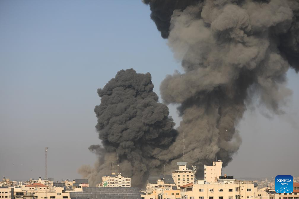 Smoke rises following Israeli airstrikes in Gaza City, on Oct. 25, 2023. The death toll of Palestinians from Israeli airstrikes on the Gaza Strip has risen to 6,546, said the Hamas-run Health Ministry in Gaza Strip on Wednesday. Meanwhile, 17,439 Palestinians were wounded in the coastal enclave, the ministry said in a statement. (Photo by Yasser Qudih/Xinhua)