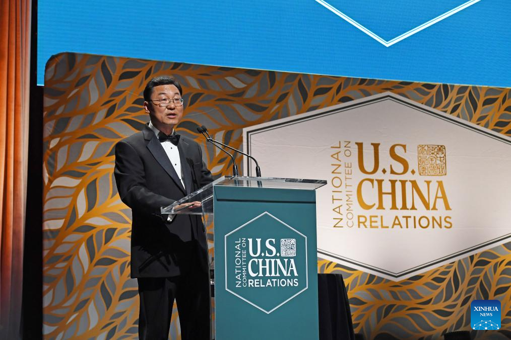 Chinese ambassador to the United States Xie Feng speaks at the annual Gala Dinner of the National Committee on U.S.-China Relations (NCUSCR) in New York, the United States, on Oct. 24, 2023. The United States and China must find a way to get along for the benefit of all, Chinese ambassador to the United States Xie Feng said here on Tuesday. (Xinhua/Li Rui)
