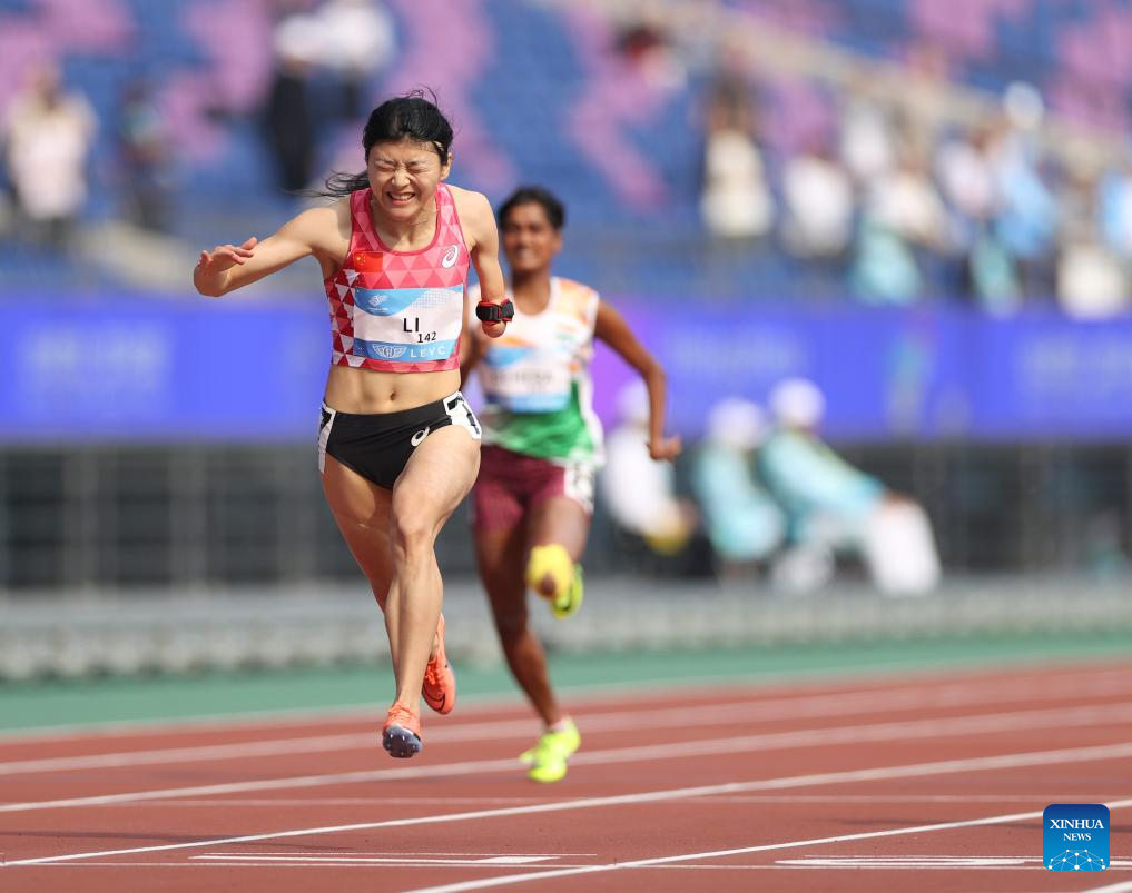 Li Lu (C) of China competes during the Women's 100m T47 final of Athletics at the 4th Asian Para Games in Hangzhou, east China's Zhejiang Province, Oct. 25, 2023. (Xinhua/Hu Xingyu)