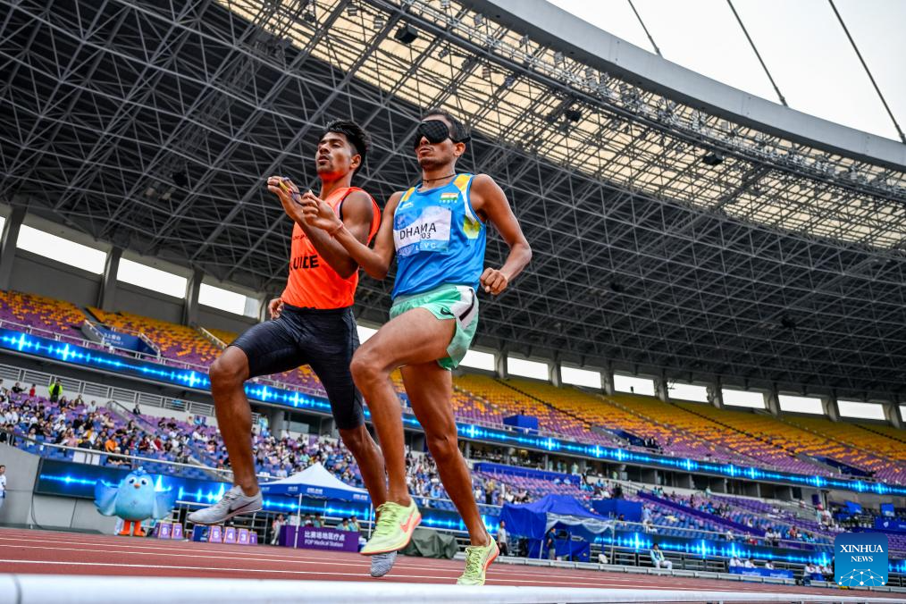 Gold medalist India's Ankur Dhama (R) runs with his guide Dharmendra Gurjar during the Men's 1500m T11 Final of Athletics at the 4th Asian Para Games in Hangzhou, east China's Zhejiang Province, Oct. 25, 2023. (Xinhua/Wu Zhizun)