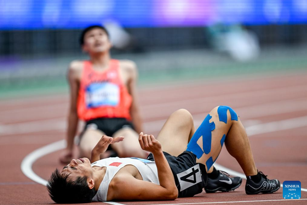 Gold medalist Deng Peicheng of China lies on the ground after the Men's 400m T36 Final of Athletics at the 4th Asian Para Games in Hangzhou, east China's Zhejiang Province, Oct. 25, 2023. (Xinhua/Wu Zhizun)