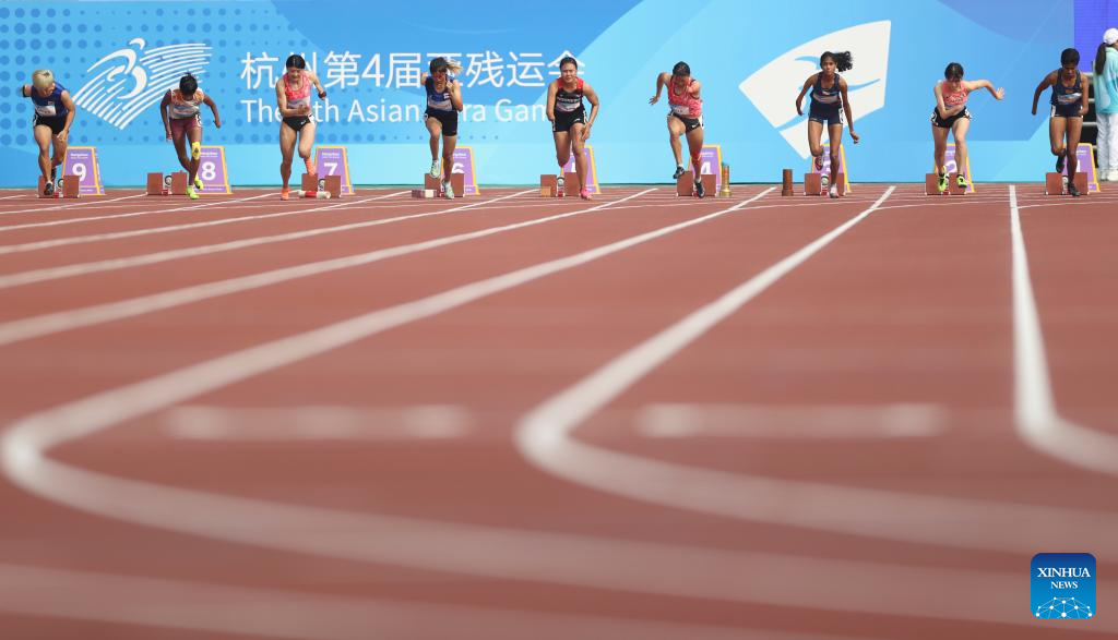 Athletes compete during the Women's 100m T47 final of Athletics at the 4th Asian Para Games in Hangzhou, east China's Zhejiang Province, Oct. 25, 2023. (Xinhua/Hu Xingyu)