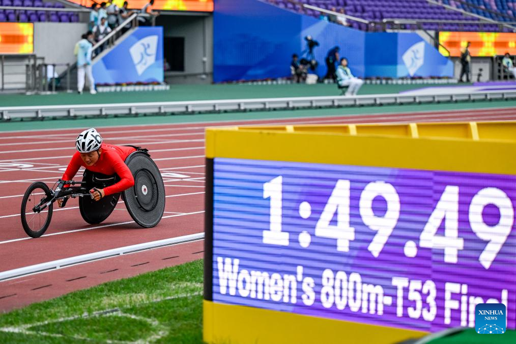 Zhou Hongzhuan of China competes during the Women's 800m T53 Final of Athletics at the 4th Asian Para Games in Hangzhou, east China's Zhejiang Province, Oct. 25, 2023. (Xinhua/Wu Zhizun)