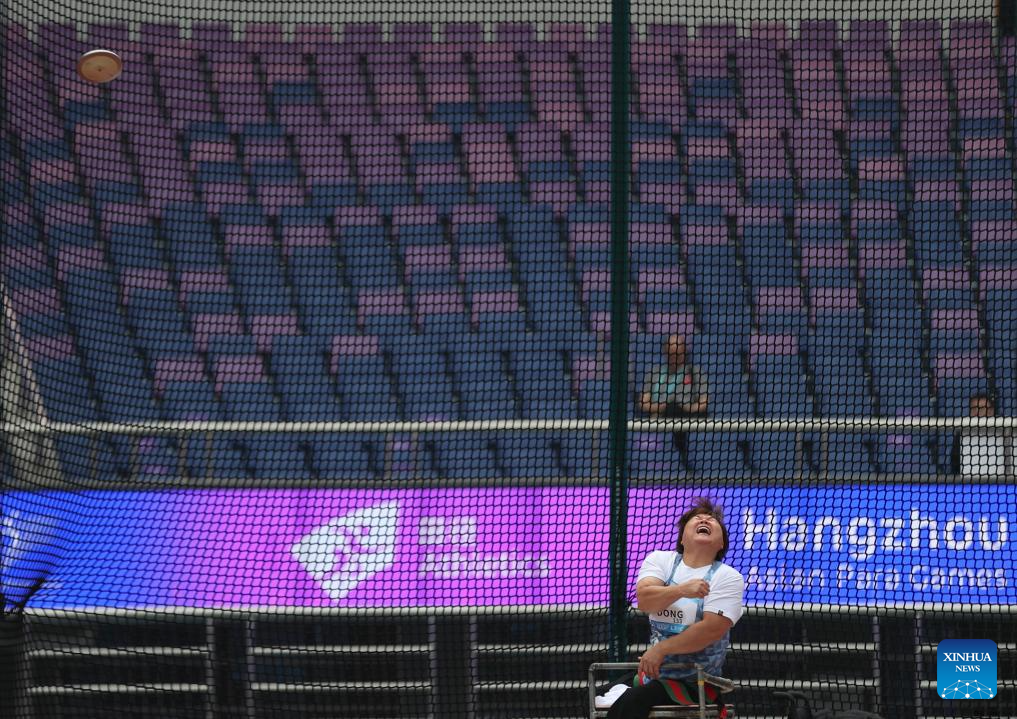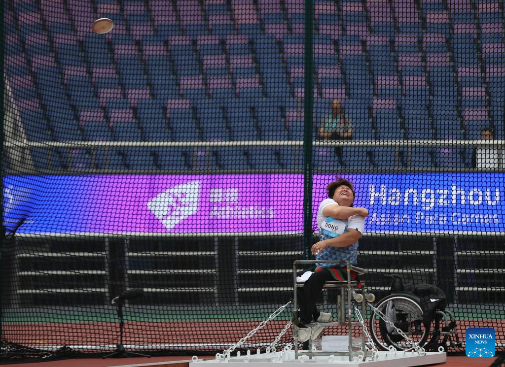 Dong Feixia of China competes during the Women's Discus Throw F54/55 final of Athletics at the 4th Asian Para Games in Hangzhou, east China's Zhejiang Province, Oct. 25, 2023. (Xinhua/Hu Xingyu)