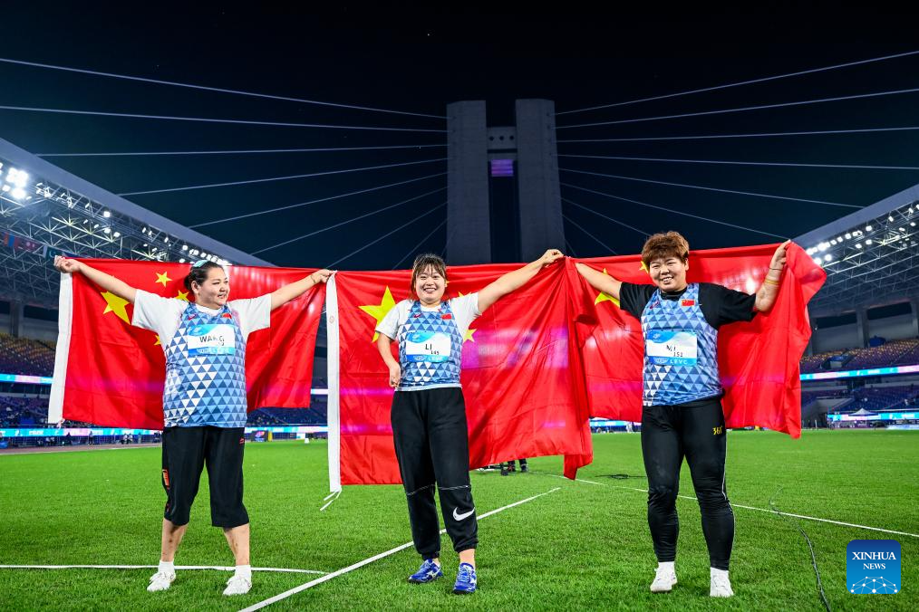 Gold medalist Li Yingli (C) of China, silver medalist Mi Na (R) of China and bronze medalist Wang Jun of China celebrate after the Women's Shot Put F35/36/37 Final of Athletics at the 4th Asian Para Games in Hangzhou, east China's Zhejiang Province, Oct. 25, 2023. (Xinhua/Wu Zhizun)