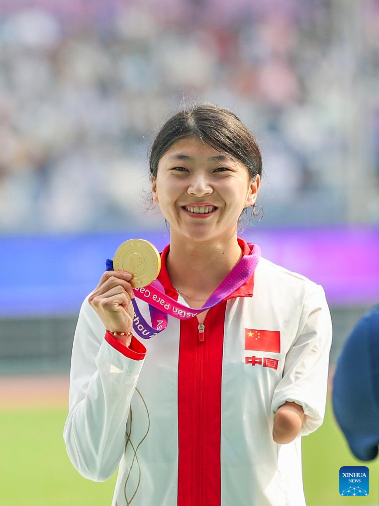 Shan Jie of China attends the awarding ceremony for the Women's 100m T47 of Athletics at the 4th Asian Para Games in Hangzhou, east China's Zhejiang Province, Oct. 25, 2023. (Xinhua/Hu Xingyu)