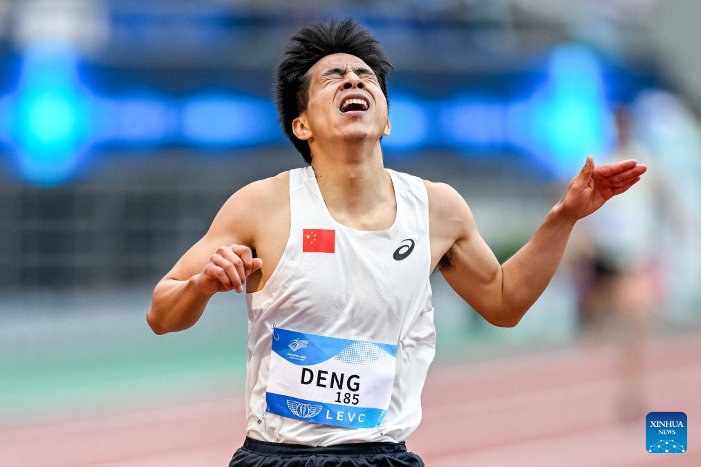 Gold medalist Deng Peicheng of China crosses the finish line during the Men's 400m T36 Final of Athletics at the 4th Asian Para Games in Hangzhou, east China's Zhejiang Province, Oct. 25, 2023. (Xinhua/Wu Zhizun)
