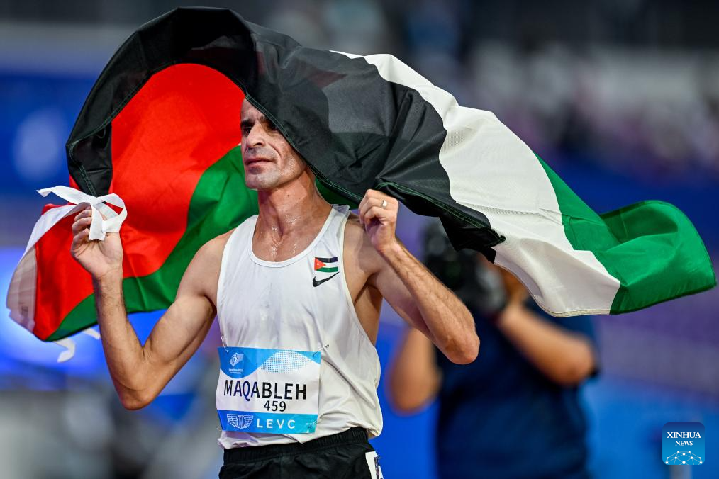Gold medalist Nabeel Khaled Ahmad Maqableh of Jordan celebrates after winning the Men's 1500m T13 Final of Athletics at the 4th Asian Para Games in Hangzhou, east China's Zhejiang Province, Oct. 25, 2023. (Xinhua/Wu Zhizun)