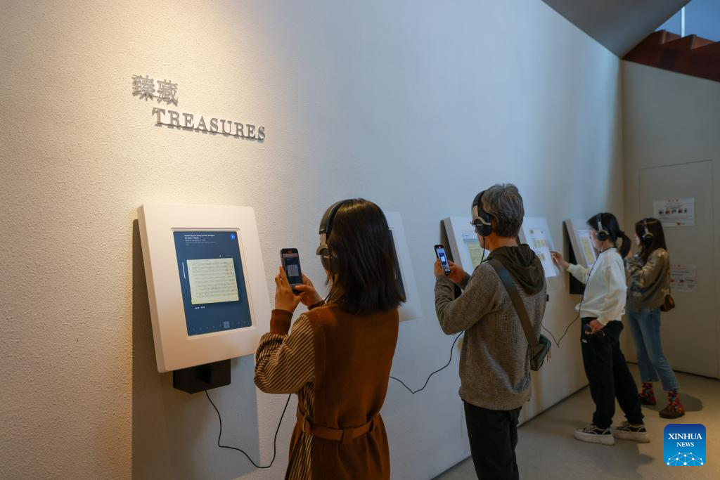 Visitors listen to the audio at the Juilliard Imagination exhibition held by the Tianjin Juilliard School in north China's Tianjin, Oct. 25, 2023. The Juilliard Imagination exhibition provides the visitors with rich displays of music, dance, and drama through audio and visual interactive experiences. (Xinhua/Sun Fanyue)