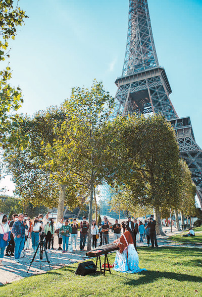 Peng Jingxuan plays the guzheng on a street in France. (Photo courtesy of the interviewee)