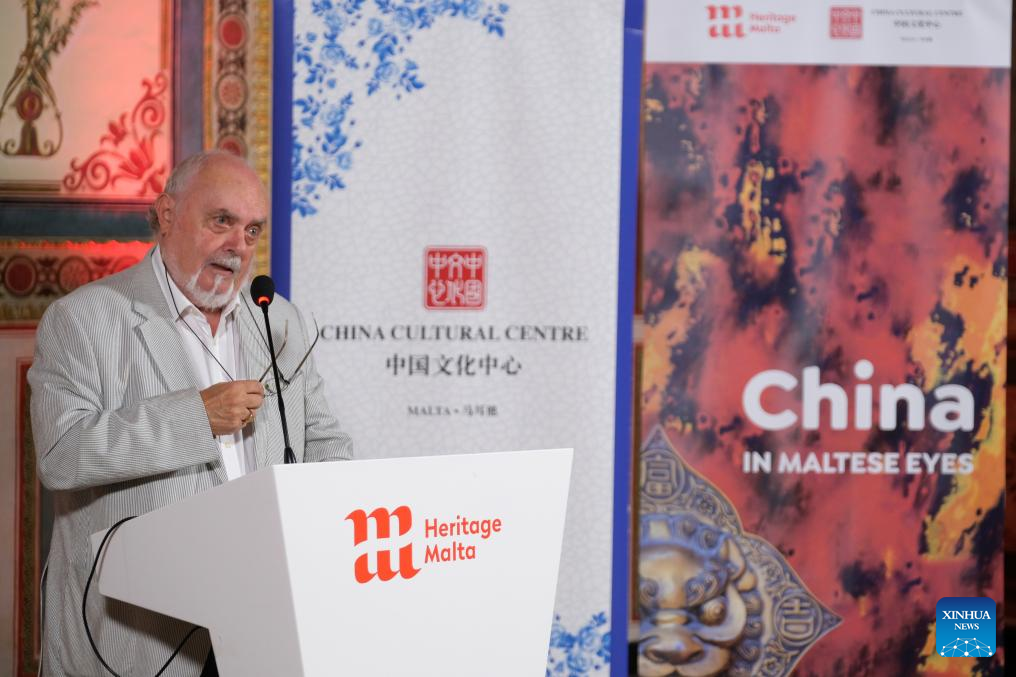 Mario Cutajar (R), chairman of Heritage Malta, speaks during the launch event of the book "China in Maltese Eyes" in Valletta, Malta, on Oct. 25, 2023. The English version of the book "China in Maltese Eyes" was launched here on Wednesday by Heritage Malta and the China Cultural Center, which began collaborating on the project two years ago. The book features contributions from over 20 Maltese people of diverse backgrounds, who have shared their experiences of Chinese culture, history, and contemporary development. (Photo by Jonathan Borg/Xinhua)