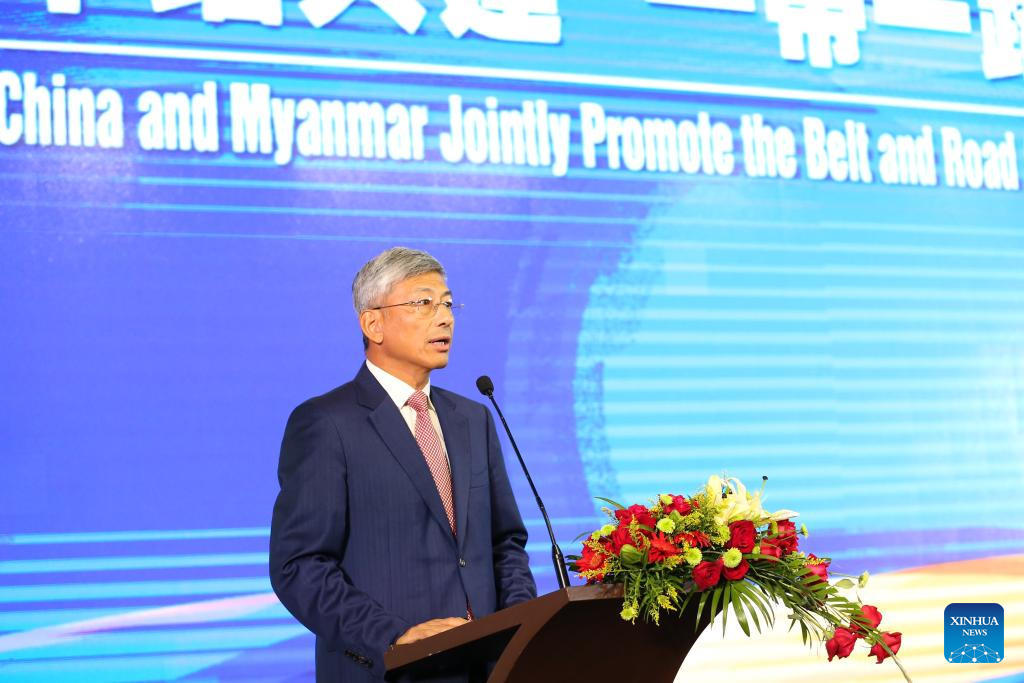 Chinese Ambassador to Myanmar Chen Hai addresses a seminar to jointly promote the Belt and Road Cooperation between China and Myanmar in Yangon, Myanmar, Oct. 26, 2023. The seminar held on Thursday featured discussions on China-Myanmar cooperation projects under the Belt and Road Initiative (BRI). (Photo by Myo Kyaw Soe/Xinhua)