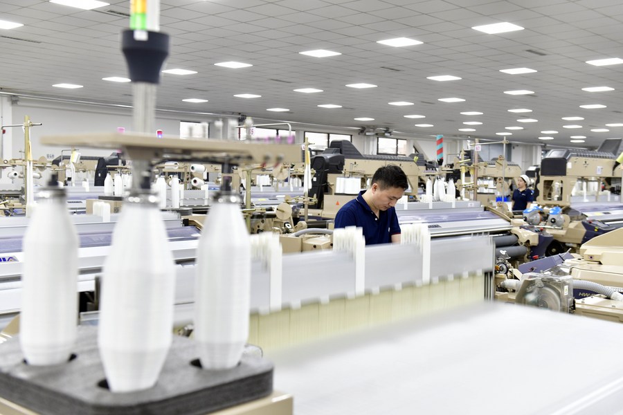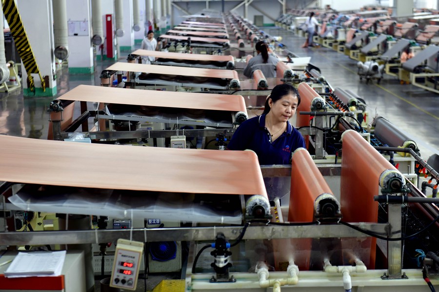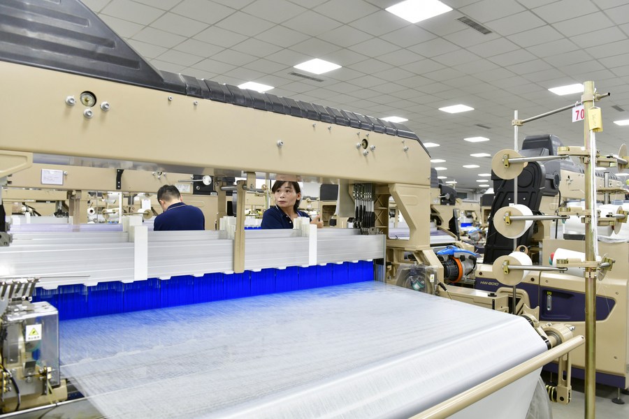Staff members work at a new material company in Dingtao District of Heze City, east China's Shandong Province, Oct. 29, 2023. (Xinhua/Guo Xulei)