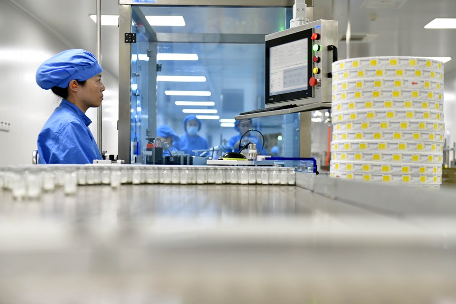 Staff members work at a pharmaceutical company in Dingtao District of Heze City, east China's Shandong Province, Oct. 29, 2023. (Xinhua/Guo Xulei)