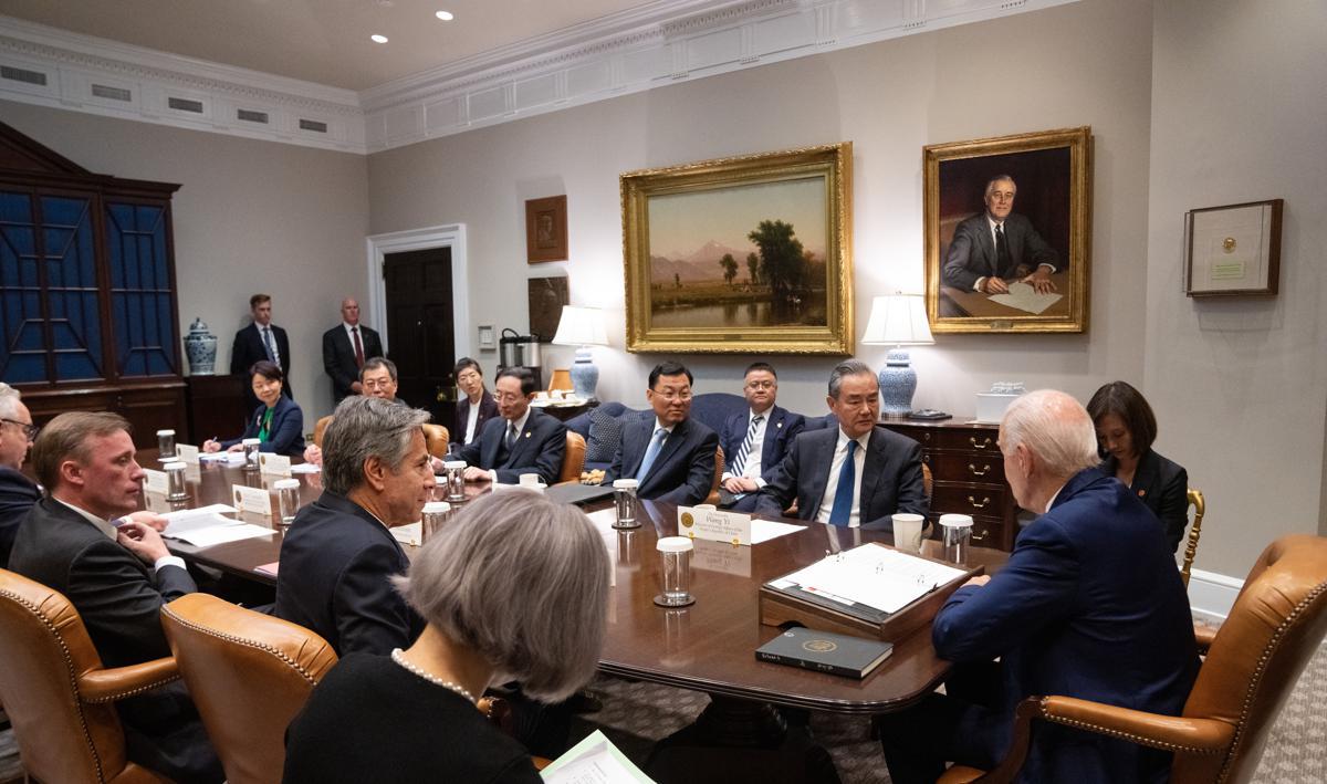 Foreign Minister Wang Yi (third from right) meets with United States President Joe Biden on Friday at the White House in Washington, DC. [Photo by Liu Jie / Xinhua]