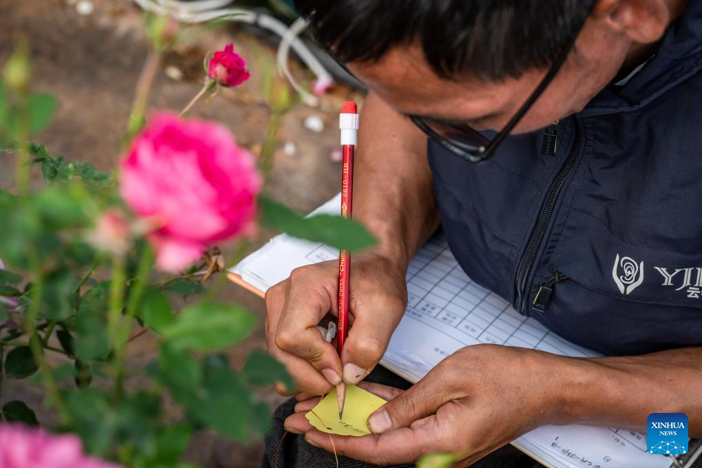 Tian Liantong takes notes of the serial numbers of roses at a roses plantation demonstration garden of a modern agricultural park in Anning City, southwest China's Yunnan Province on Oct. 20, 2023. (Xinhua/Hu Chao)