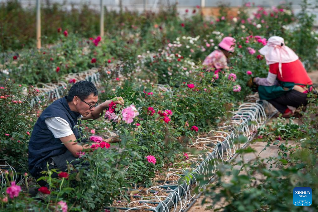 Tian Liantong checks roses at a roses plantation demonstration garden of a modern agricultural park in Anning City, southwest China's Yunnan Province on Oct. 20, 2023. (Xinhua/Hu Chao)