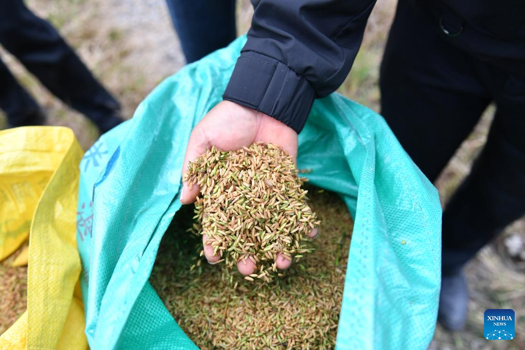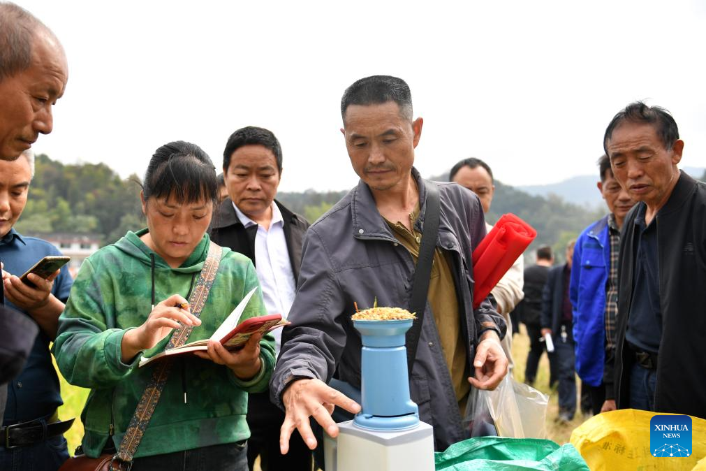 Staff members measure moisture content of ratoon rice in a field in Shuangfeng County of Loudi City, central China's Hunan Province, Oct. 28, 2023. To improve the utilization rate of farmland, Shuangfeng County is trying to experiment with a new agricultural model that enables a field to grow rice, ratoon rice and cole in different seasons of the same year. (Xinhua/Chen Zhenhai)