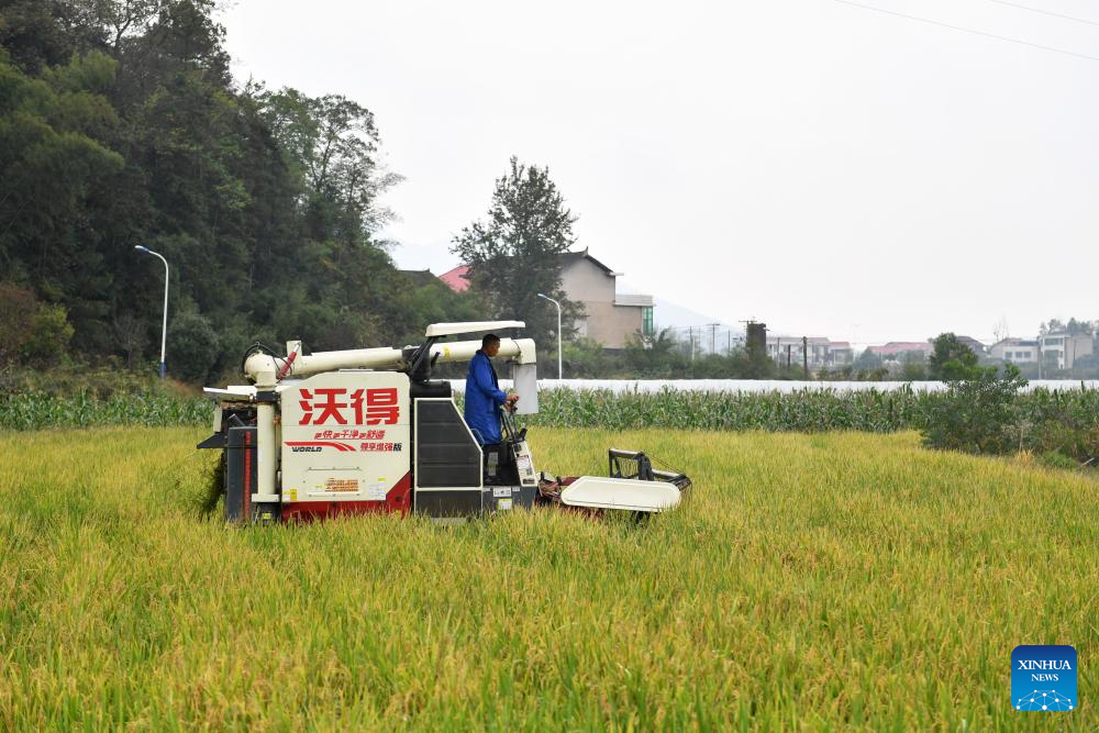 A farmer harvests ratoon rice in a field in Shuangfeng County of Loudi City, central China's Hunan Province, Oct. 28, 2023. To improve the utilization rate of farmland, Shuangfeng County is trying to experiment with a new agricultural model that enables a field to grow rice, ratoon rice and cole in different seasons of the same year. (Xinhua/Chen Zhenhai)