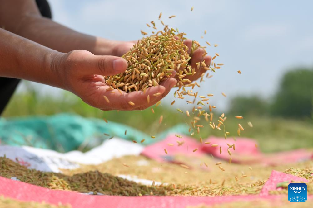 This photo taken on Aug. 10, 2023 shows newly-harvested rice in Shuangfeng County of Loudi City, central China's Hunan Province. To improve the utilization rate of farmland, Shuangfeng County is trying to experiment with a new agricultural model that enables a field to grow rice, ratoon rice and cole in different seasons of the same year. (Photo by Li Jianxin/Xinhua)
