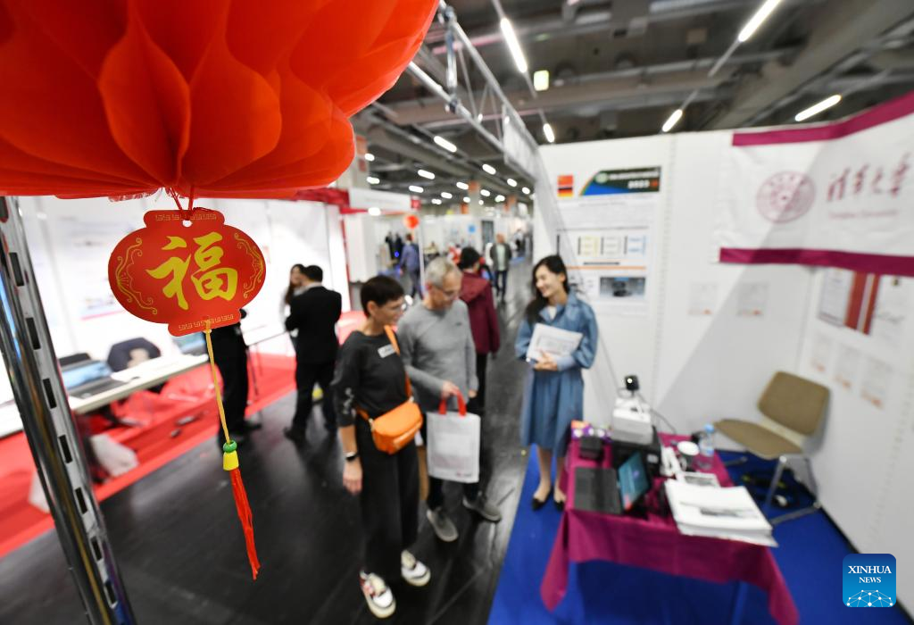 People visit the booth of Tsinghua University at the 75th international inventors' trade fair in Nuremberg, Germany, Oct. 28, 2023.