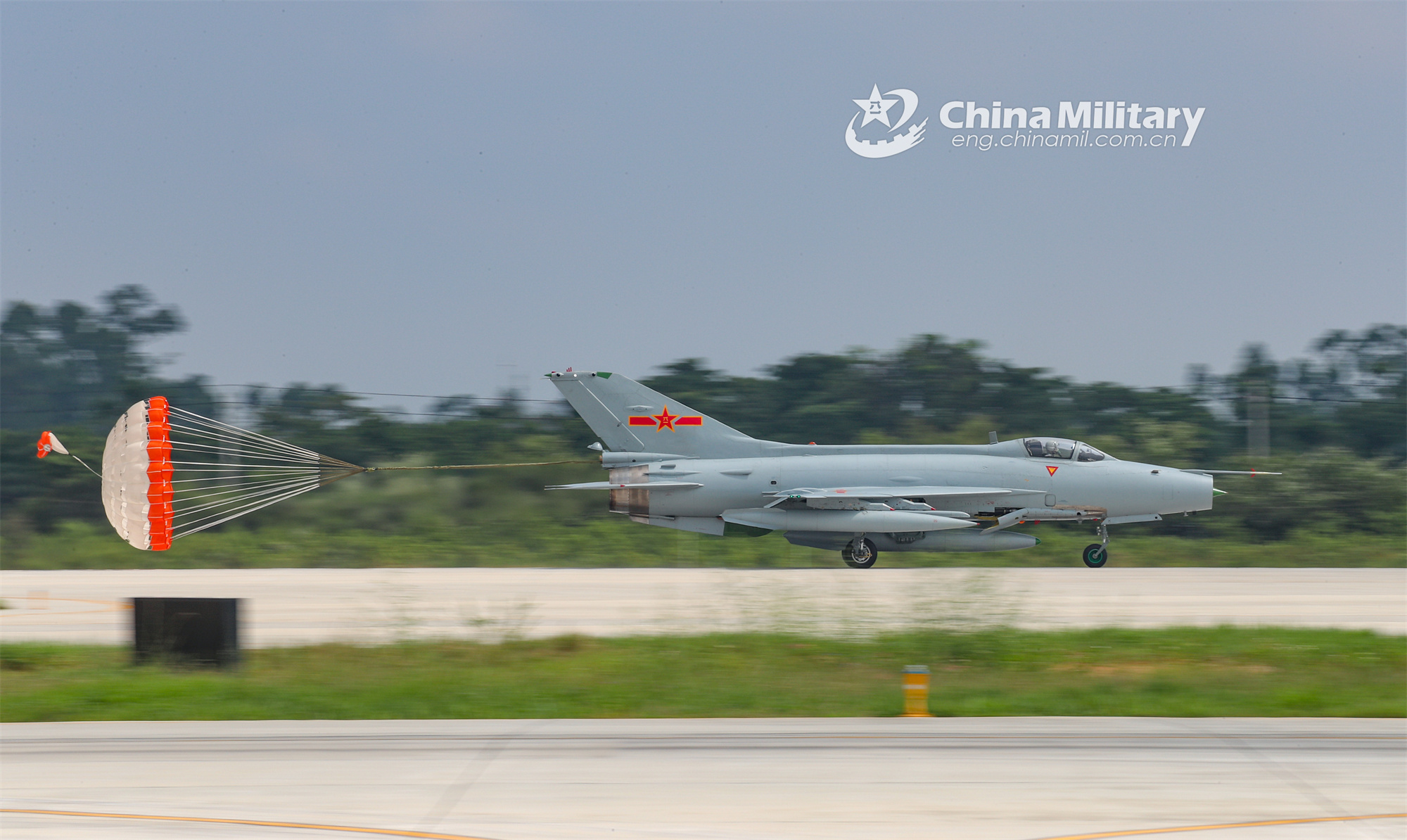 A fighter jet attached to an aviation brigade of the air force under the PLA Southern Theater Command deploys drogue parachute to slow down after landing during a flight training mission in early October, 2023. (eng.chinamil.com.cn/Photo by Huang Rongkai)