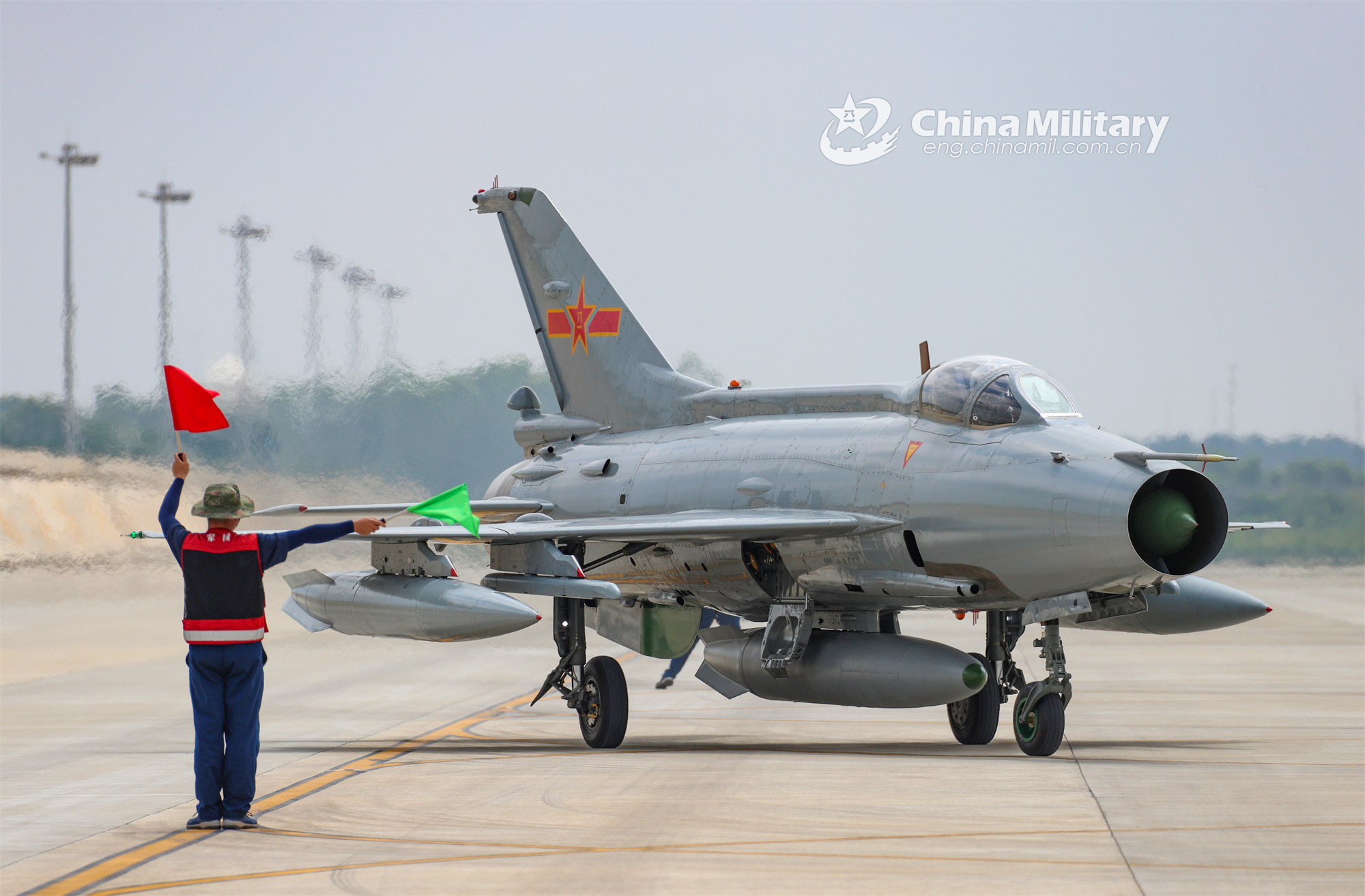 A ground crew member assigned to an aviation brigade of the air force under the PLA Southern Theater Command uses flag signal to guide a fighter jet during a flight training mission in early October, 2023. (eng.chinamil.com.cn/Photo by Huang Rongkai)
