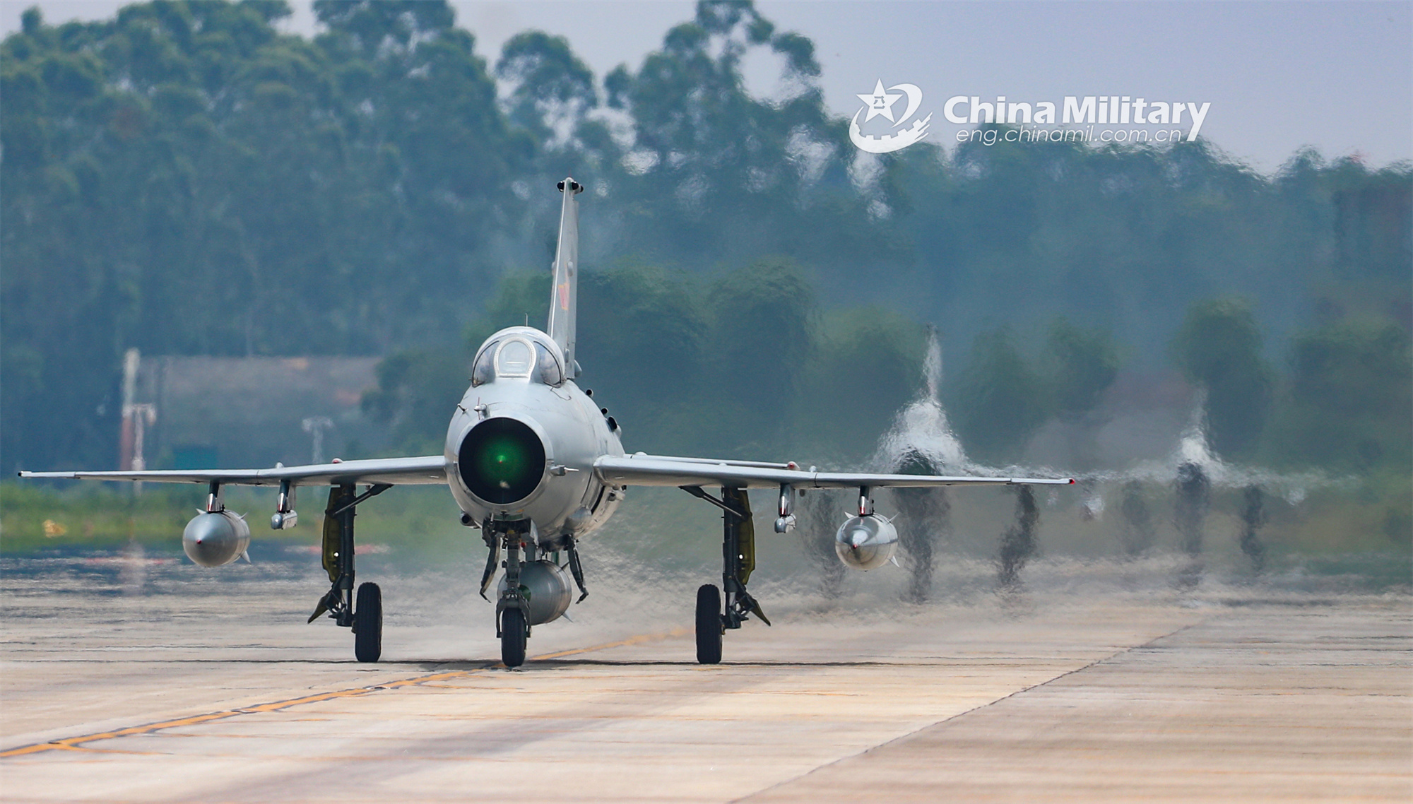 Fighter jets attached to an aviation brigade of the air force under the PLA Southern Theater Command taxi in close formation before takeoff during a flight training mission in early October, 2023. (eng.chinamil.com.cn/Photo by Huang Rongkai)