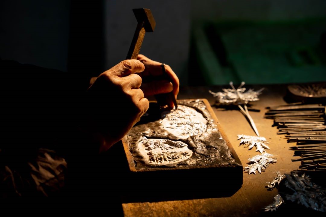 A silversmith makes silver jewelry in Shidong town, Taijiang county, southwest China's Guizhou Province, Oct. 28, 2023. (People's Daily Online/Yang Qian)