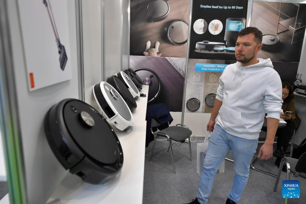 A visitor checks exhibits during the 7th China Commodity Fair in Moscow, Russia, on Oct. 30, 2023. This event is held here from Oct. 30 to Nov. 1. (Photo by Alexander Zemlianichenko Jr/Xinhua)