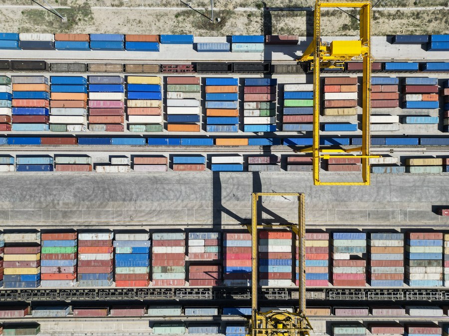 This aerial photo taken on May 11, 2023 shows a crane loading containers at a railway port in Horgos, northwest China's Xinjiang Uygur Autonomous Region. (Xinhua/Hao Zhao)