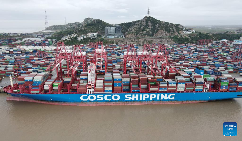 This aerial photo taken on Oct. 13, 2021 shows container vessel of the China COSCO Shipping docking at Yangshan Port, east China's Shanghai. (Xinhua/Fang Zhe)