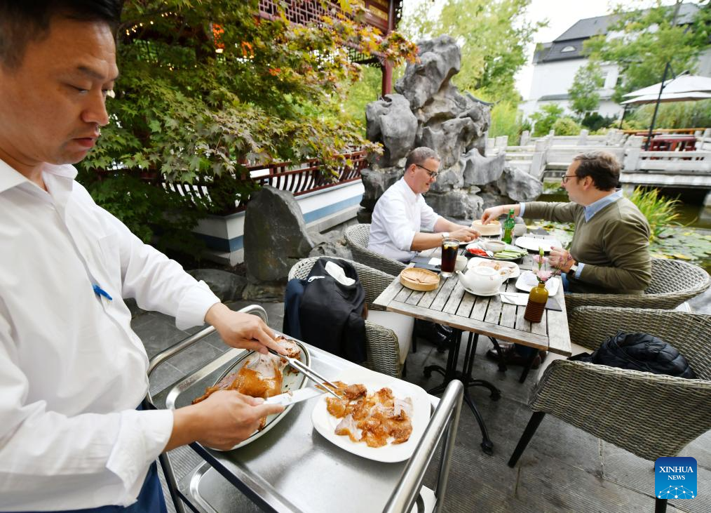 This photo taken on Sept. 28, 2023 shows a chef slicing roast duck for guests at Yuyuan Garden in Hamburg, Germany. (Xinhua/Ren Pengfei)