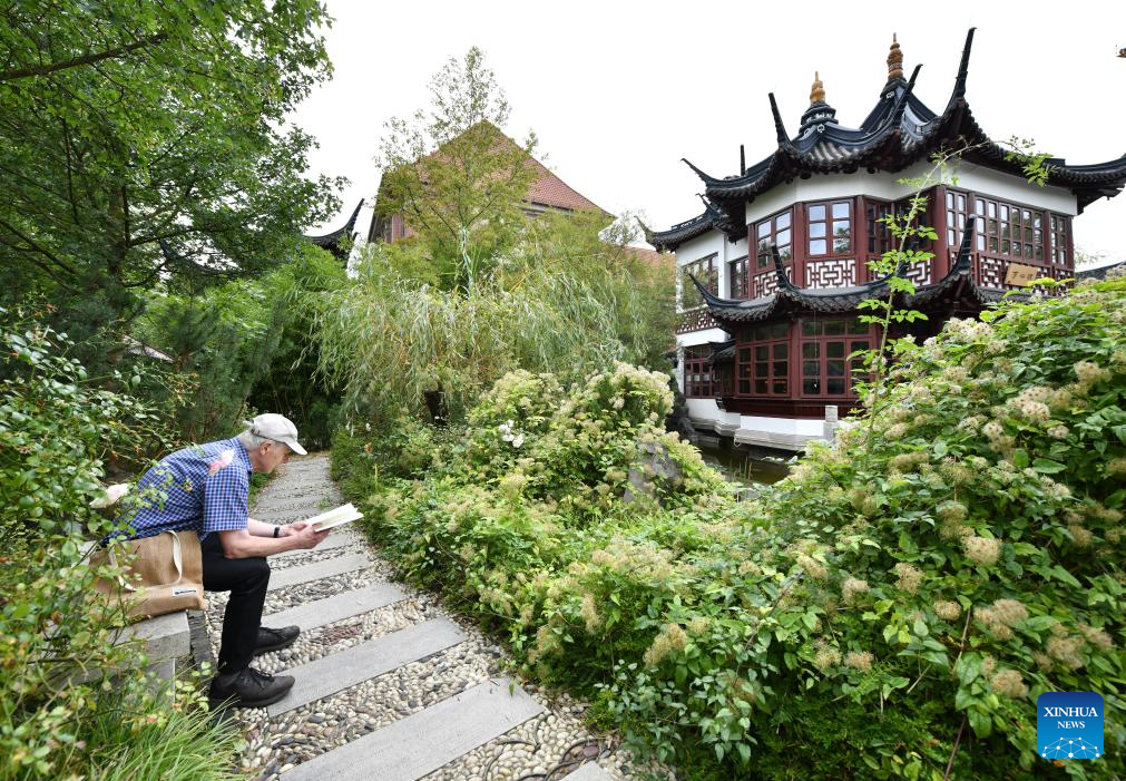 This photo taken on Sept. 29, 2023 shows a man reading at Yuyuan Garden in Hamburg, Germany. (Xinhua/Ren Pengfei)