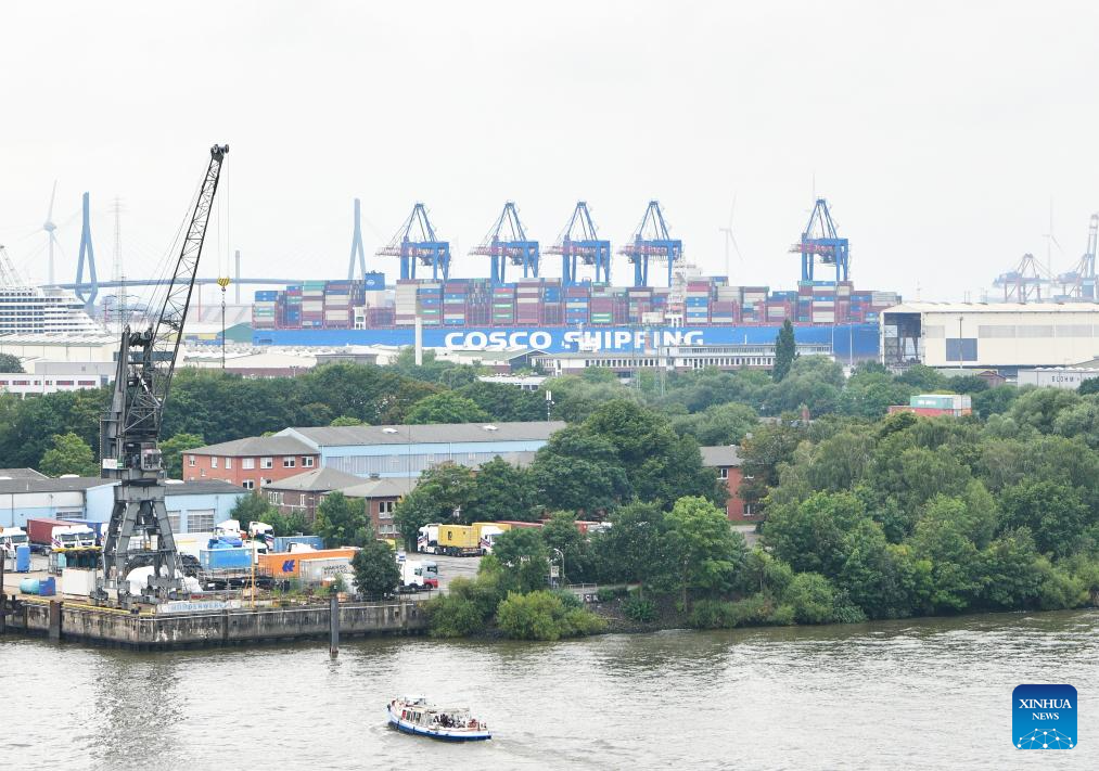 This photo taken on Aug. 12, 2023 shows a container vessel of the China COSCO Shipping docking at Port of Hamburg, Germany. (Xinhua/Ren Pengfei)