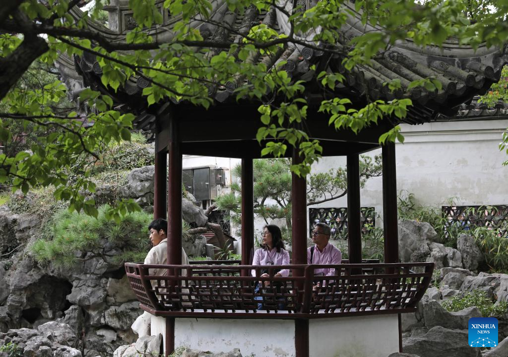 This photo taken on Oct. 12, 2023 shows tourists resting at a pavilion at Yuyuan Garden in east China's Shanghai. (Xinhua/Liu Ying)