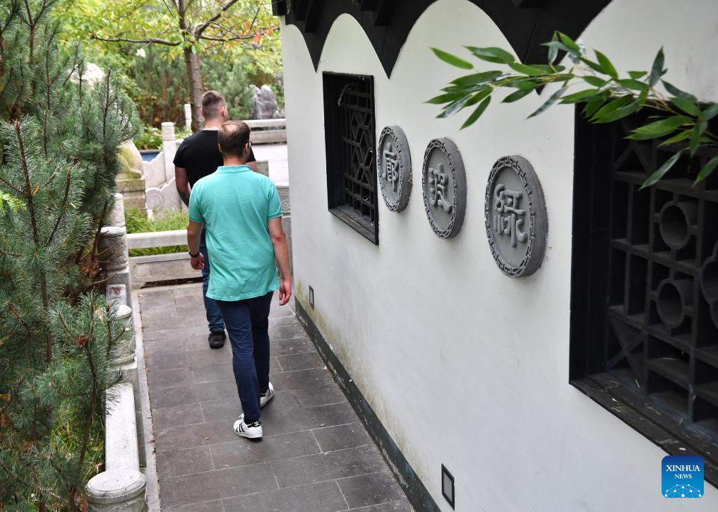 This photo taken on Sept. 29, 2023 shows tourists walking out of Yuyuan Garden in Hamburg, Germany. (Xinhua/Ren Pengfei)