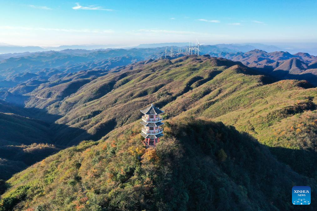 This aerial photo taken on Nov. 1, 2023 shows the autumn view of a forest farm in Longshan County of Xiangxi Tujia and Miao Autonomous Prefecture, central China's Hunan Province. (Photo by Zeng Xianghui/Xinhua)